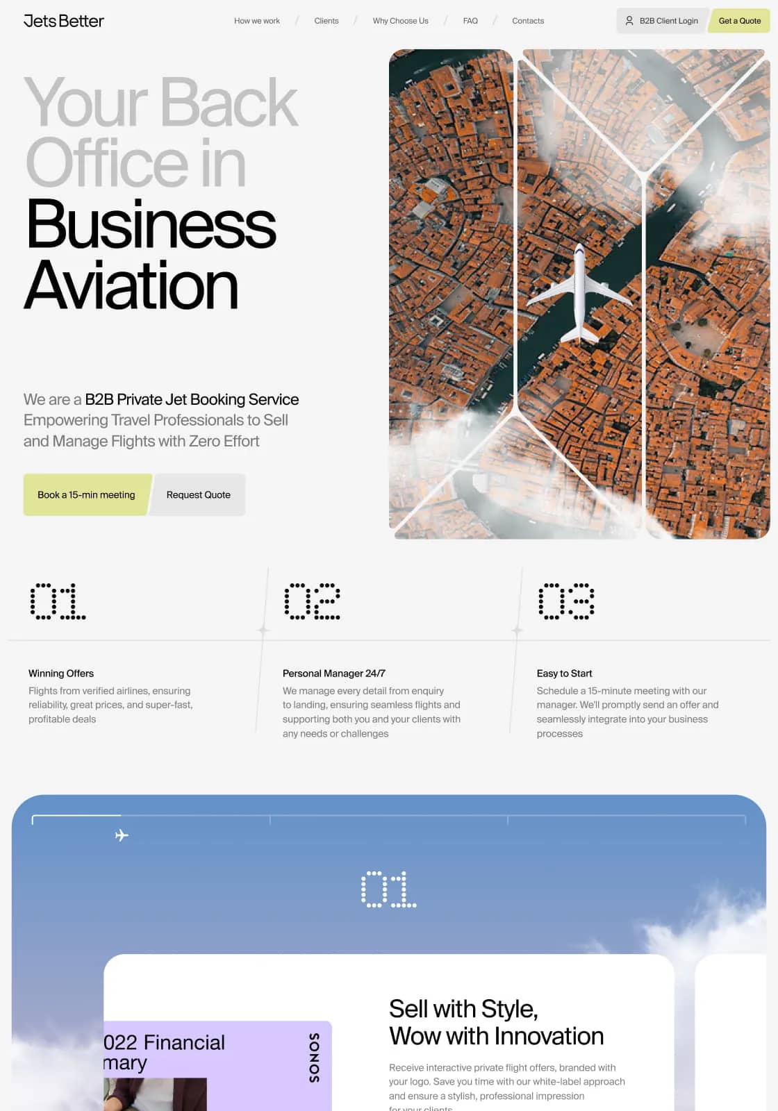 Developed a dynamic landing page for Jetsbetter, a B2B private jet booking service. Utilized GSAP for smooth animations and SwiperJS for interactive elements. The website effectively communicates Jetsbetter's unique selling points and services to travel professionals, positioning the company as a reliable partner in the luxury travel industry.